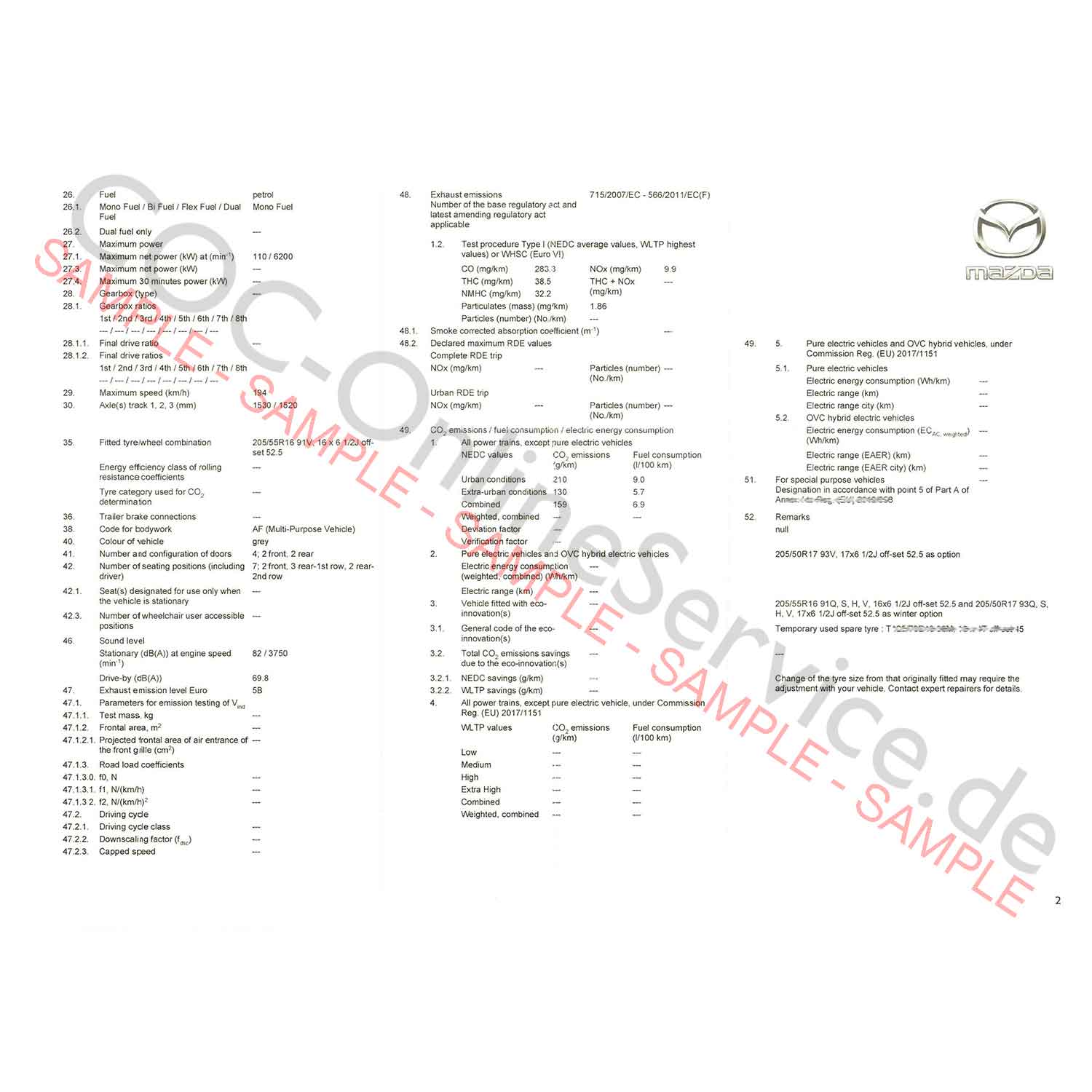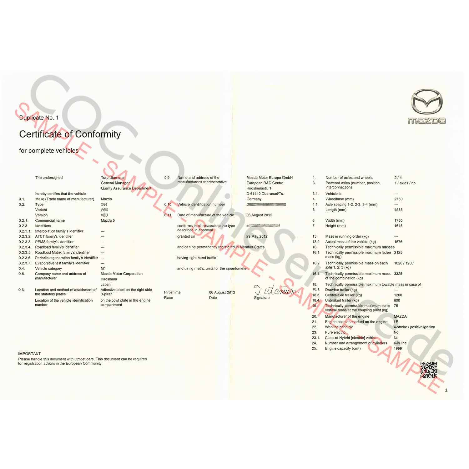 Documents COC pour Mazda (Certificat de Conformité)