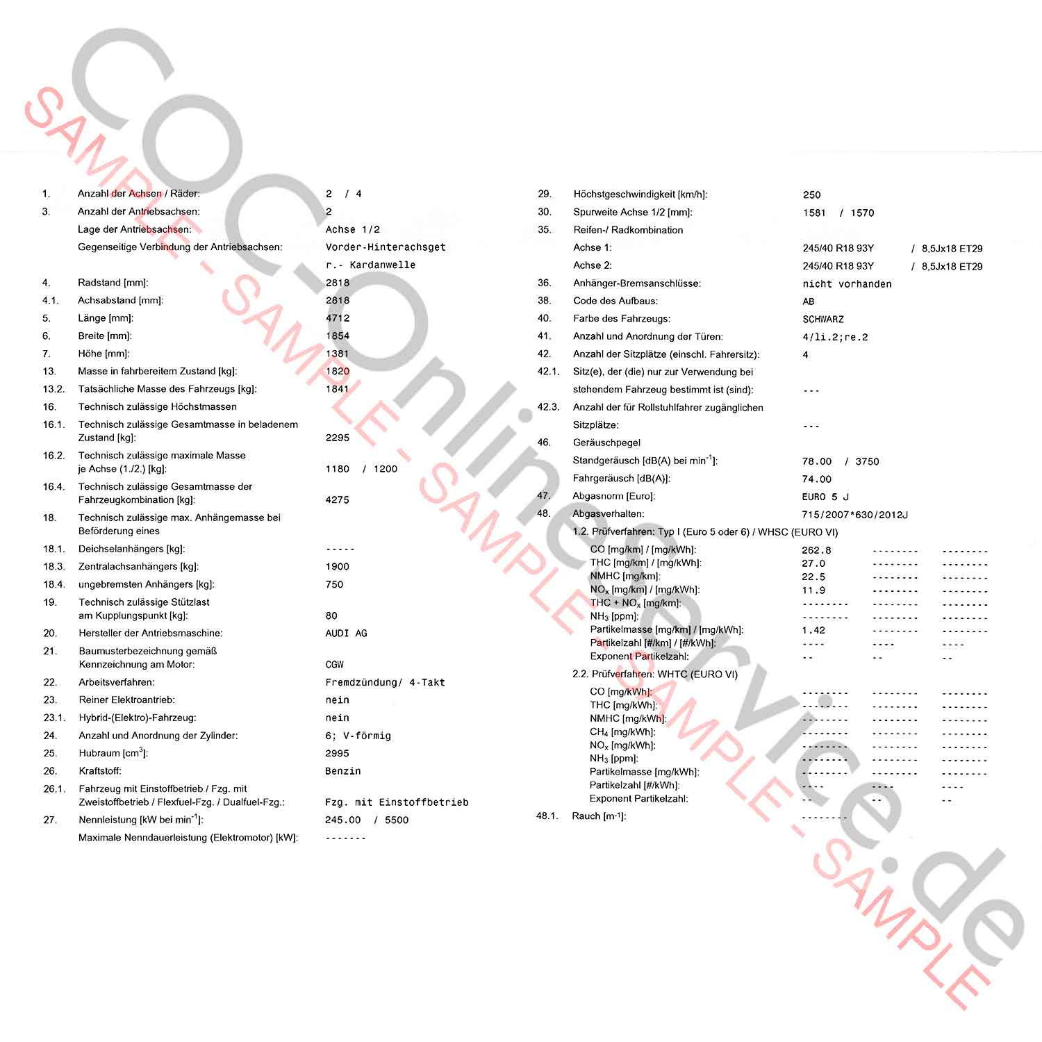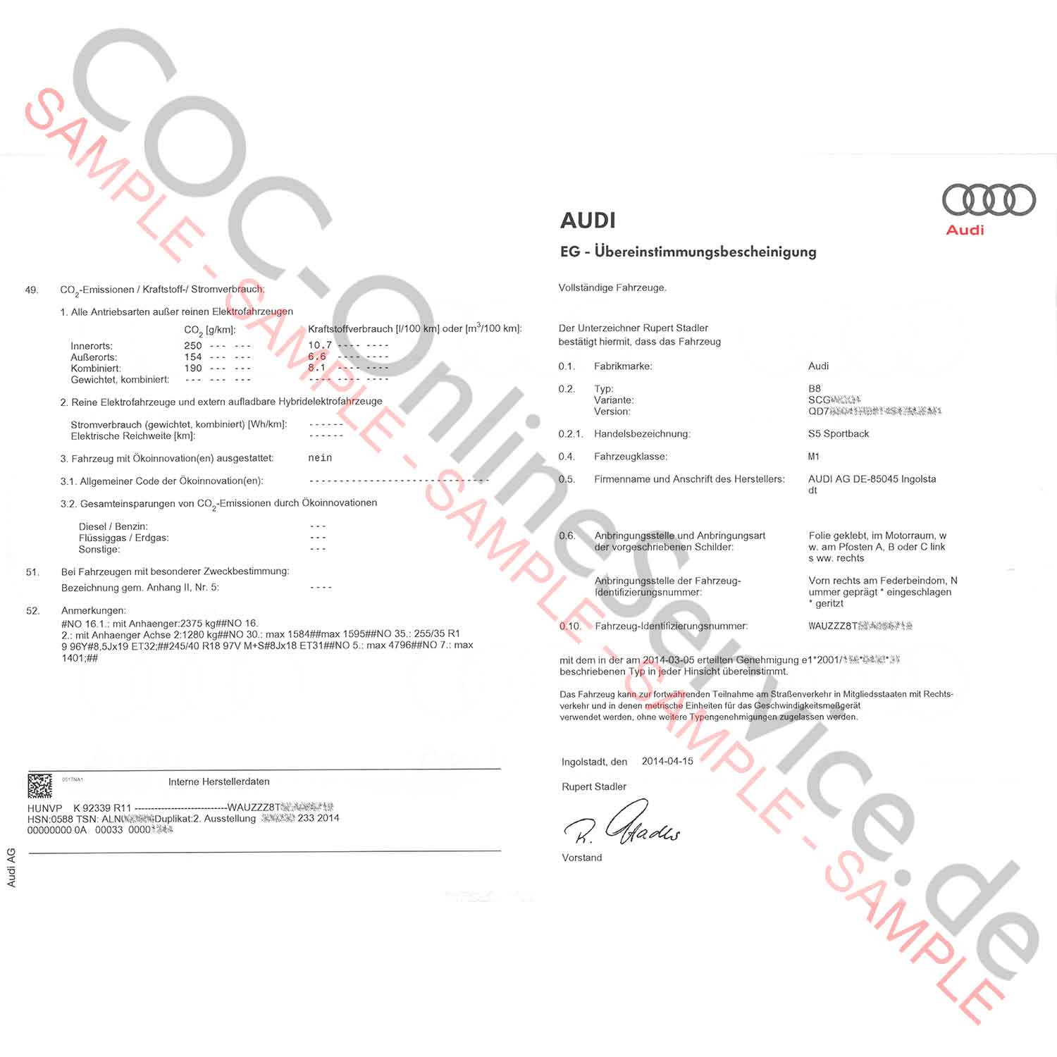 Gdy tylko dokument zostanie sporządzony przez producenta pojazdu, otrzymasz wiadomość e-mail z plikiem PDF COC. Dzięki tej kopii można w wielu przypadkach zarejestrować pojazd lub przeprowadzić przegląd techniczny. Oryginał dokumentu zostanie wysłany pocztą lub przesyłką ekspresową.